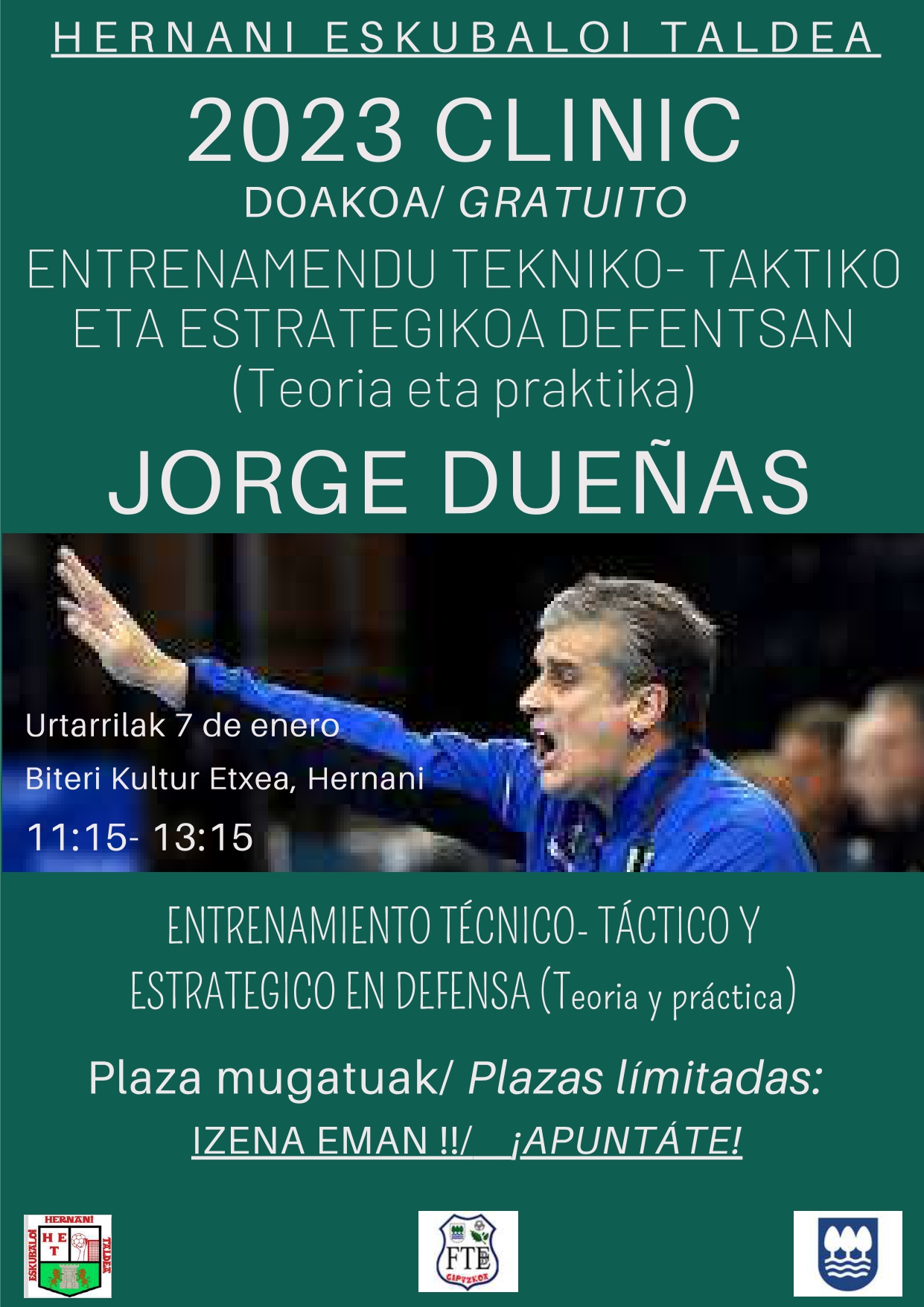 Hernani Eskubaloi Taldeak (HET), urtarrilak 7rako, Hernaniko Kultur Etxean, Jorge Dueñasen Clinic bat antolatu dugula jakinarazi nahi dizuegu: JORGE DUEÑAS: entrenamendu tekniko-taktiko eta estrategikoa...