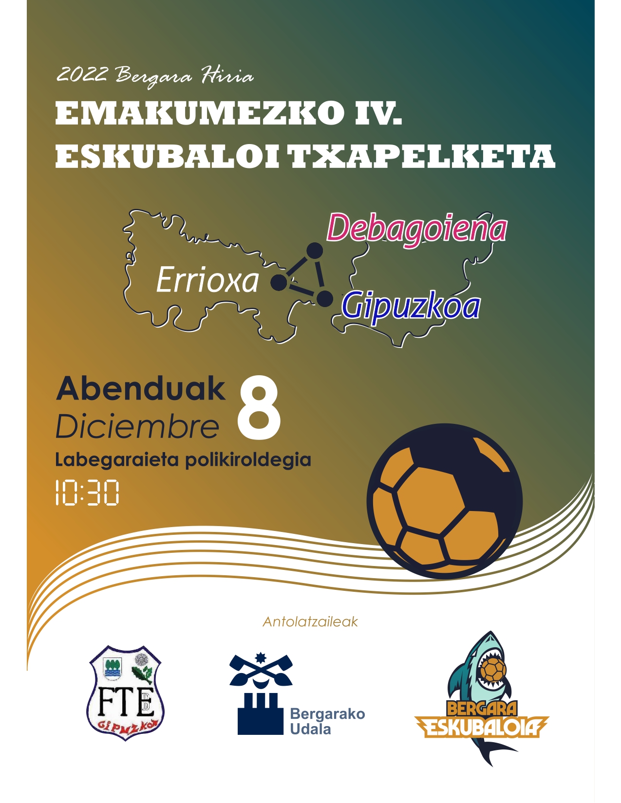 2022 Bergara Hiria Emakumezko IV. Eskubaloi Txapelketa Osteguna abenduak 8 goizeko 10:30etan. Labegaraieta polikiroldegia (Bergara) Laugarren aldiz egiten den txapellketa da. Hiru talde izango...