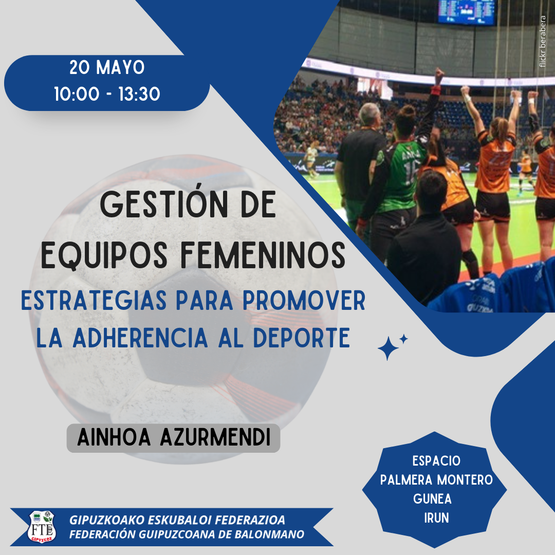 FORMACIÓN para Entrenadores y Entrenadoras sobre Gestión de Equipos Femeninos. Estrategias para promover la adherencia al Deporte. Será impartida por Ainhoa Azurmendi. Lugar: Espacio...