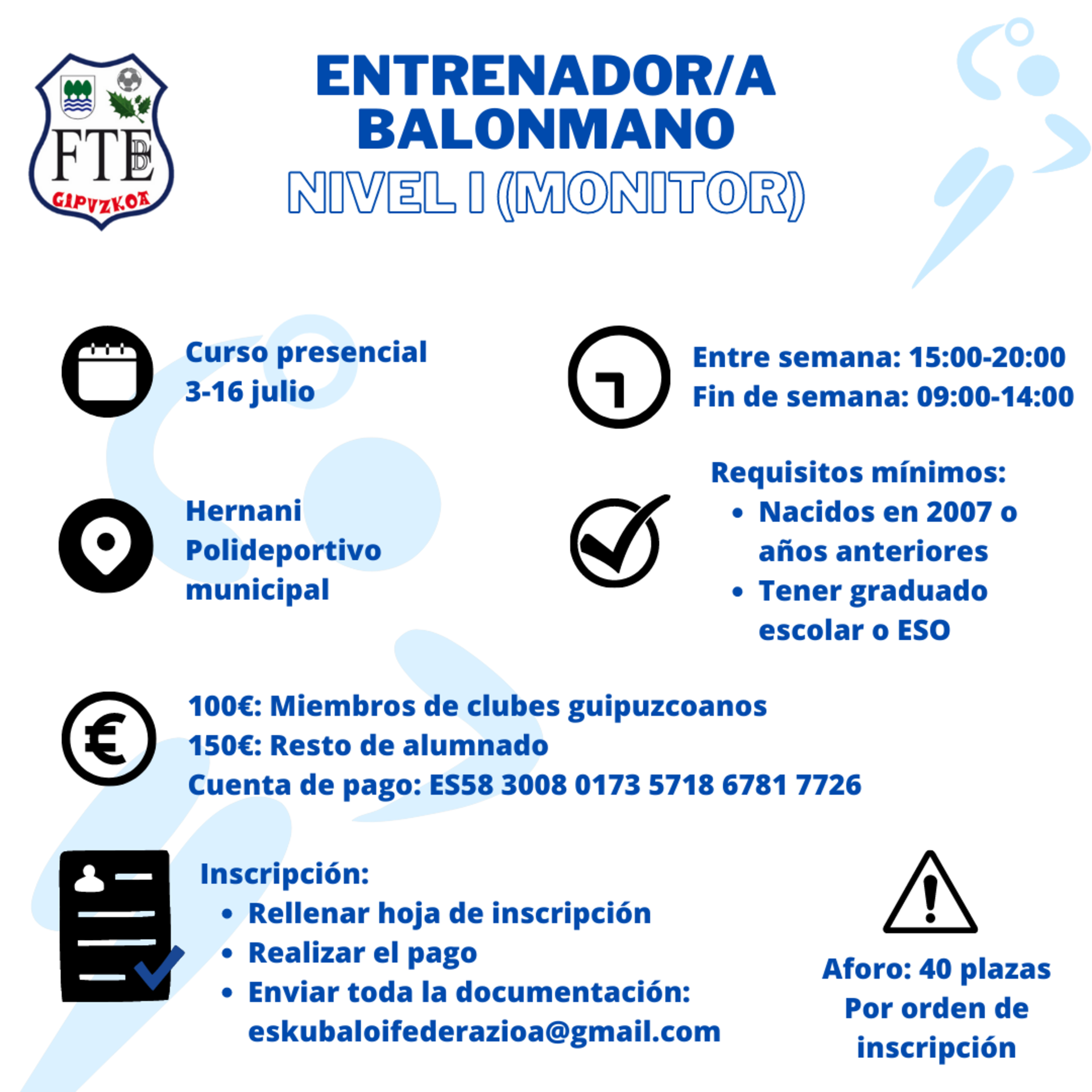 CURSO ENTRENADOR/A NIVEL I (Monitor) Curso presencial en castellano Lugar: Polideportivo de Hernani Fechas: Desde el 3 de julio al 16 de julio de...